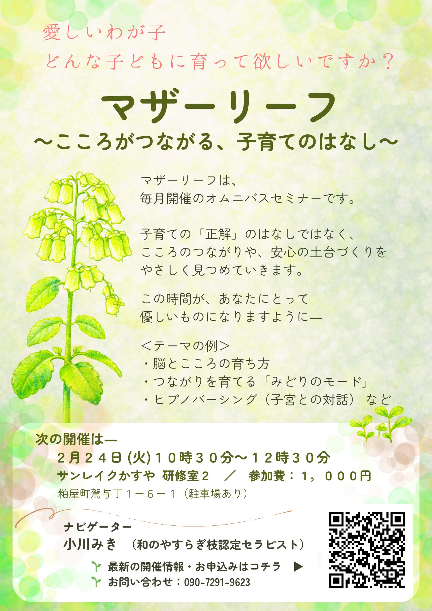 | 内容 | 1. マザーリーフのはなし 2. 子どものこころはどう育つ?(脳の超基礎) 3. 記憶と自律神経のはなし 4. つながりモードってなに? 5. 今日からできる「お母さんの安心ポイント」(ワーク) 6. まとめ(メッセージ)「子どものために、まずお母さんが安心しよう、安心していいよ」 |